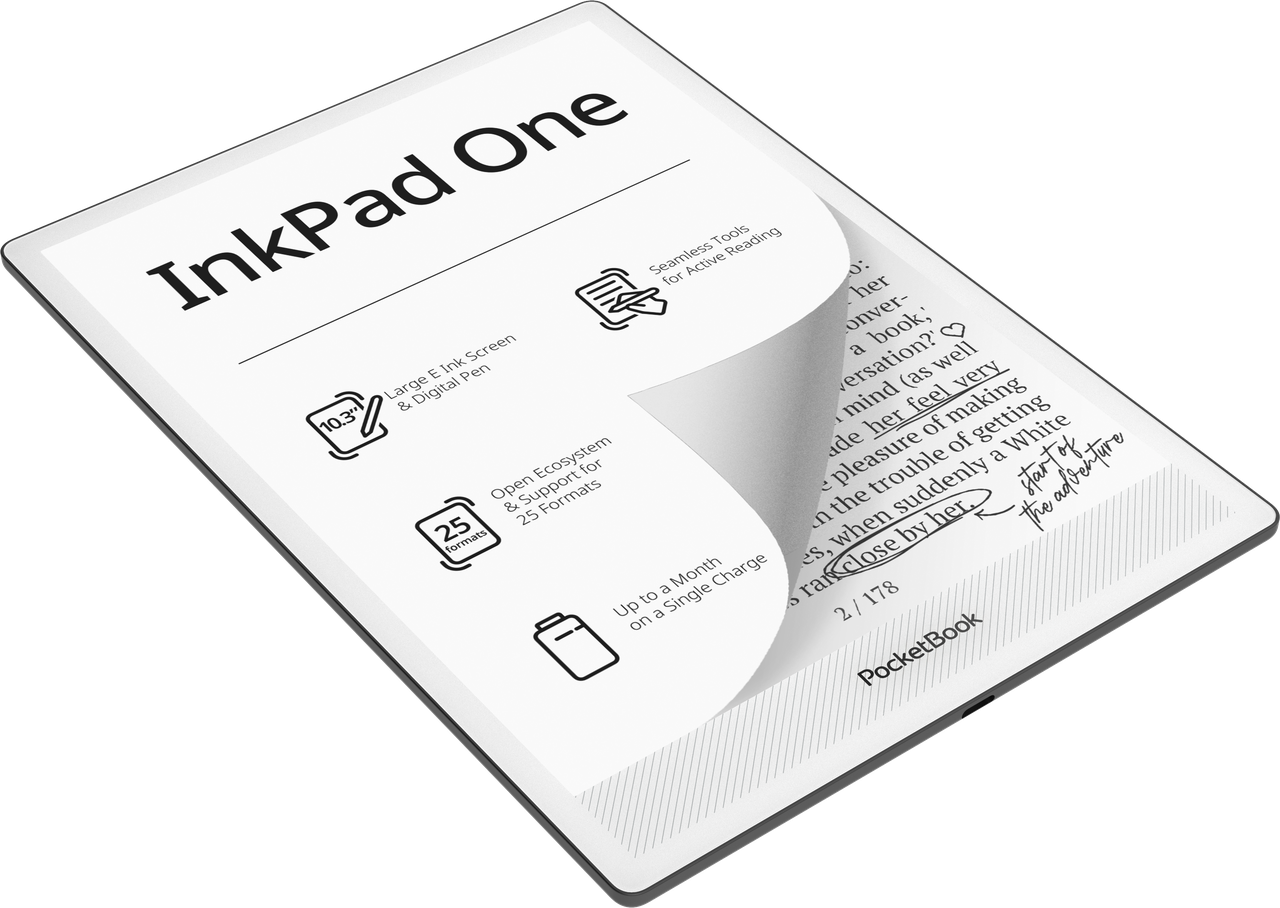 O PocketBook InkPad One possui um grande ecrã E Ink Mobius de 10,3”, considerado mais flexível e, por isso, mais durável do que os ecrãs E Ink tradicionais com base em vidro. O ecrã é seguro para os olhos e sem reflexos, reproduzindo fielmente a aparência do papel real: mantém-se fácil de ler mesmo sob luz solar intensa. O tamanho generoso do ecrã facilita a visualização de mais texto de uma só vez ou o aumento do tamanho da fonte sem ter necessidade de virar constantemente as páginas. A tecnologia E Ink consome energia apenas quando o conteúdo é alterado, proporcionando uma longa duração da bateria. Como resultado, o InkPad One oferece até 2 meses de leitura sem recarregar, dependendo da utilização e das configurações.
